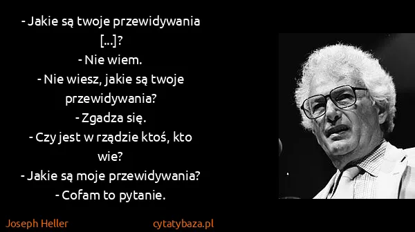 - A co pan powie na te okresowe okresy nudy, zmęczenia, depresji i apatii? - osaczał go wirującym szeptem Yossarian. - Obojętnie słucham rzeczy, które innym ludziom wydają się ważne. Męczą mnie informacje, których nie mogę wykorzystać. Wolałbym, żeby gazety codzienne były mniejsze i wychodziły raz w tygodniu. Nie interesuje mnie już nic, co się dzieje na świecie. Komicy nie rozśmieszają mnie, a długie opowieści doprowadzają do furii. Nic już nie porusza mnie tak jak kiedyś. Czy to ja, czy świat zrobił się nudny? Gdybym był młodszy, być może chciałbym ocalić siebie, a nawet większą część ludzkości. Gdyby moje dzieci były młodsze, poczuwałbym się za nie do pewnej odpowiedzialności. Gdybym bardziej kochał swoje wnuki i uważał je za urocze, trząsłbym się o ich bezpieczeństwo i miał ochotę krzyczeć. A nie odczuwam nic z tych rzeczy i mam dość przekonywania siebie, że być może powinienem. Mój entuzjazm się wyczerpał.