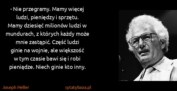 - Nie przegramy. Mamy więcej ludzi, pieniędzy i sprzętu. Mamy dziesięć milionów ludzi w mundurach, z których każdy może mnie zastąpić. Część ludzi ginie na wojnie, ale większość w tym czasie bawi się i robi pieniądze. Niech ginie kto inny.