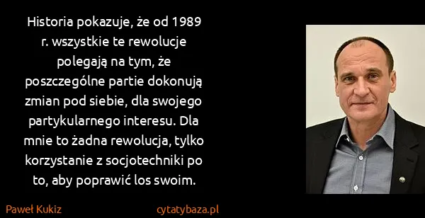 Historia pokazuje, że od 1989 r. wszystkie te rewolucje polegają na tym, że poszczególne partie dokonują zmian pod siebie, dla swojego partykularnego interesu. Dla mnie to żadna rewolucja, tylko korzystanie z socjotechniki po to, aby poprawić los swoim.