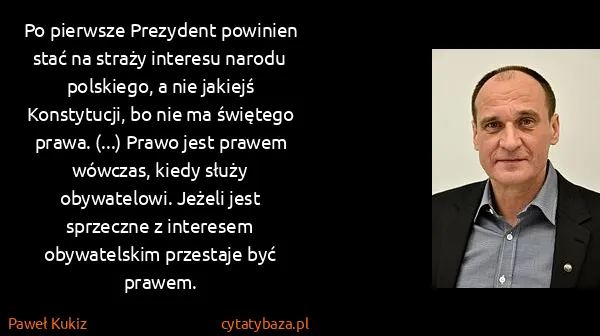Po pierwsze Prezydent powinien stać na straży interesu narodu polskiego, a nie jakiejś Konstytucji, bo nie ma świętego prawa. (...) Prawo jest prawem wówczas, kiedy służy obywatelowi. Jeżeli jest sprzeczne z interesem obywatelskim przestaje być prawem.