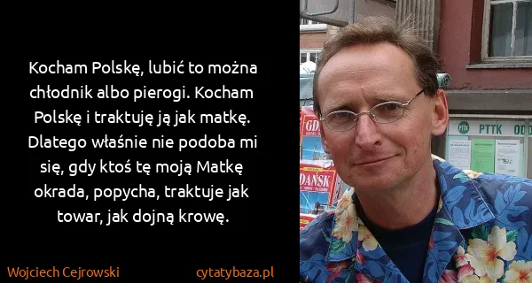 Kocham Polskę, lubić to można chłodnik albo pierogi. Kocham Polskę i traktuję ją jak matkę. Dlatego właśnie nie podoba mi się, gdy ktoś tę moją Matkę okrada, popycha, traktuje jak towar, jak dojną krowę.