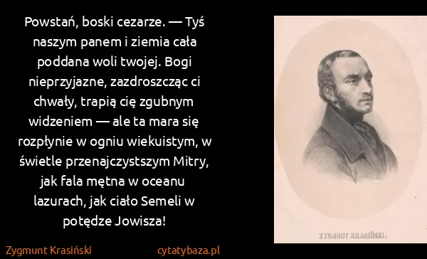 Powstań, boski cezarze. — Tyś naszym panem i ziemia cała poddana woli twojej. Bogi nieprzyjazne, zazdroszcząc ci chwały, trapią cię zgubnym widzeniem — ale ta mara się rozpłynie w ogniu wiekuistym, w świetle przenajczystszym Mitry, jak fala mętna w oceanu lazurach, jak ciało Semeli w potędze Jowisza!