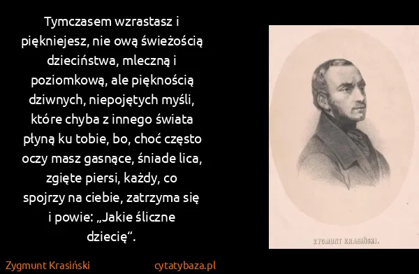 Tymczasem wzrastasz i piękniejesz, nie ową świeżością dzieciństwa, mleczną i poziomkową, ale pięknością dziwnych, niepojętych myśli, które chyba z innego świata płyną ku tobie, bo, choć często oczy masz gasnące, śniade lica, zgięte piersi, każdy, co spojrzy na ciebie, zatrzyma się i powie: „Jakie śliczne dziecię“.