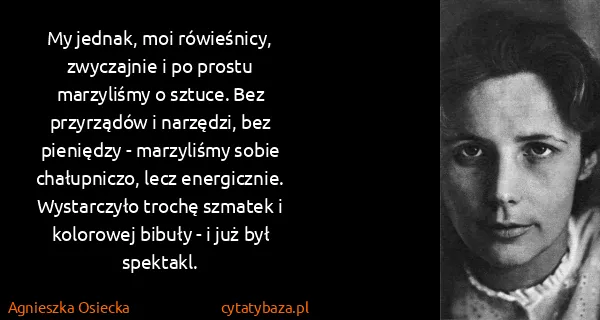 My jednak, moi rówieśnicy, zwyczajnie i po prostu marzyliśmy o sztuce. Bez przyrządów i narzędzi, bez pieniędzy - marzyliśmy sobie chałupniczo, lecz energicznie. Wystarczyło trochę szmatek i kolorowej bibuły - i już był spektakl.