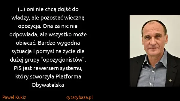 (...) oni nie chcą dojść do władzy, ale pozostać wieczną opozycją. Ona za nic nie odpowiada, ale wszystko może obiecać. Bardzo wygodna sytuacja i pomysł na życie dla dużej grupy "opozycjonistów". PiS jest rewersem systemu, który stworzyła Platforma Obywatelska